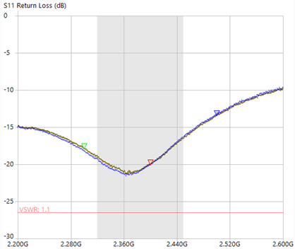 Anpassung bei 2,4 GHz ca. -20dB recht breitbandig.