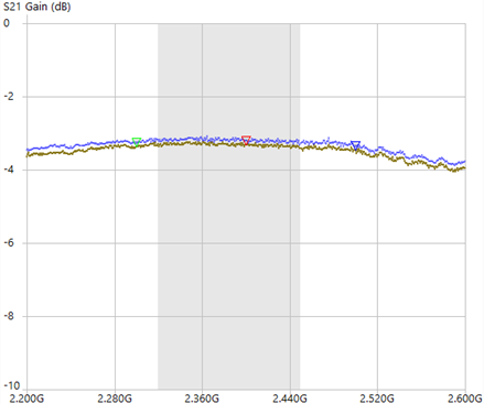 Einfügedämpfung 3,3 – 3,4dB (idealer Wert wäre 3,0 dB), das entspricht einem Verlust von ca. 7 %