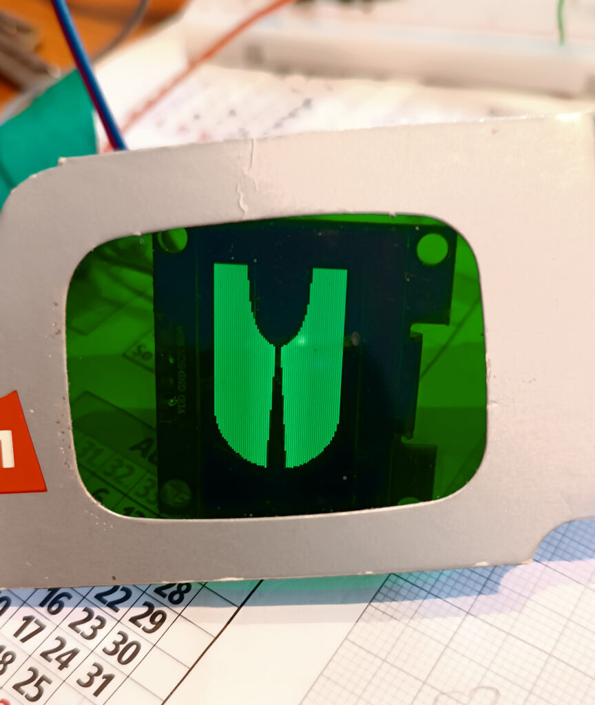 In der Regel sind die Displays weiß, und nicht in der typischen grünen Farbe der EM85-Röhre erhältlich. Dies lässt sich jedoch leicht mit einer farbigen Filterfolie beheben. In meinem Projekt habe ich dazu die grüne Folie einer alten Anaglyph‑3D‑Brille verwendet – die klassischen Brillen mit zwei verschiedenfarbigen Gläsern (meist rot und grün), die für ältere 3D-Filme, Comics und 3D-Fotos genutzt wurden.