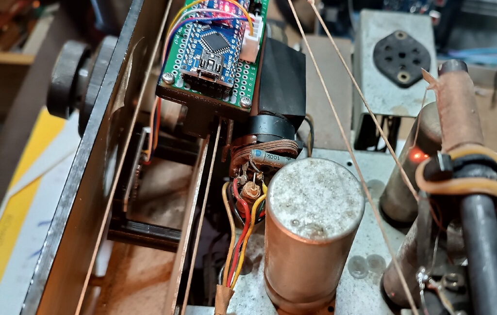 In diesem Gerät befindet sich hinter dem Skalenglas eine Blechplatte. Darauf wurde das OLED-Modul mithilfe von kleinen Magneten befestigt. Diese Lösung ist stabil und ermöglicht es, die Position der Anzeige einfach zu justieren, sodass sie exakt hinter dem Sichtfenster sitzt.