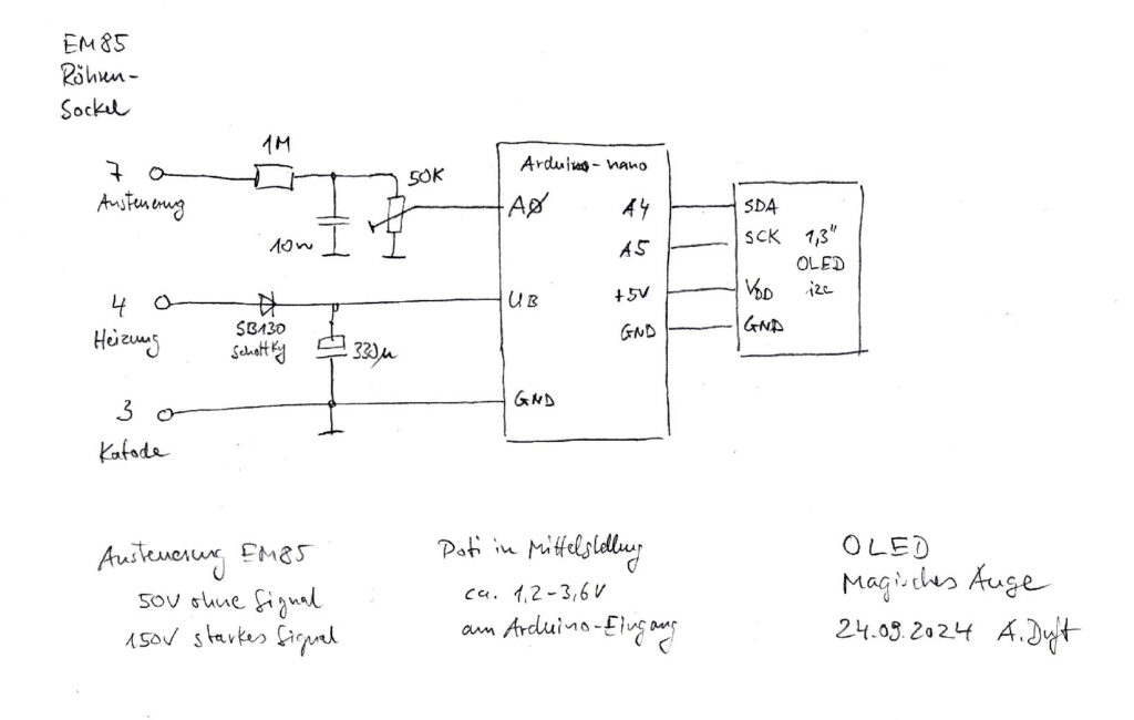 Für die Ansteuerung und Spannungsversorgung des OLED-Moduls reicht eine minimalistische Schaltung mit einem Arduino-Entwicklungsboard. Die benötigte Betriebsspannung sowie das Signal für die Anzeige der Signalstärke lassen sich meist direkt am Sockel der EM85-Röhre abgreifen.