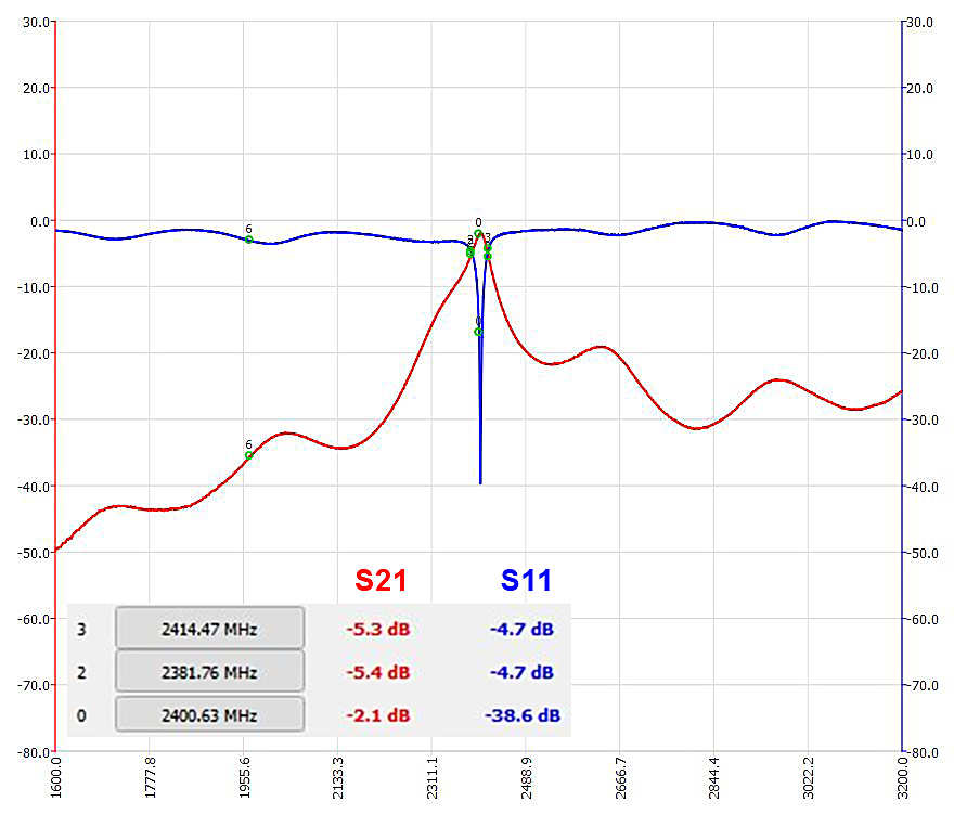 Ich habe mehrere Exemplare aufgebaut und getestet. Wenn man eine etwas größere Bandbreite akzeptiert, lässt sich die Durchlassdämpfung auf unter 0,8 dB reduzieren. Solch geringe Verluste erreicht man mit handelsüblichen SAW-Filtern in diesem Frequenzbereich typischerweise nicht. Gerade für QO-100-Anwendungen mit begrenzter Sendeleistung ist diese geringe Dämpfung ein klarer Vorteil.
