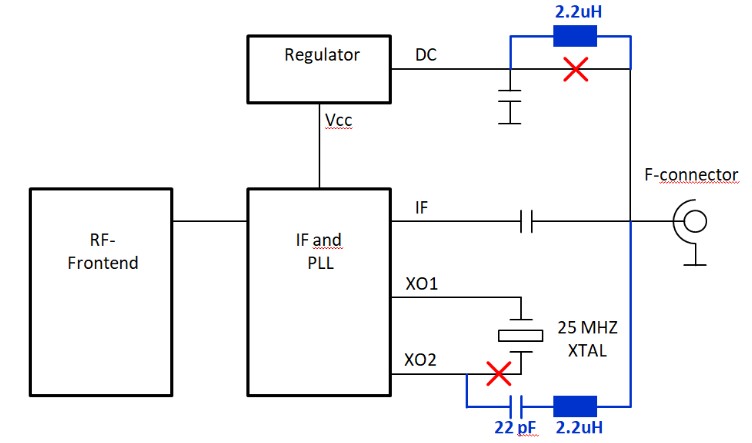 Andere LNB-Typen besitzen ein abweichendes Platinenlayout, das Grundprinzip des Umbaus ist jedoch identisch. Der interne Quarz wird vom PLL-IC getrennt und über einen Bandpass, das Referenzsignal eingespeist.